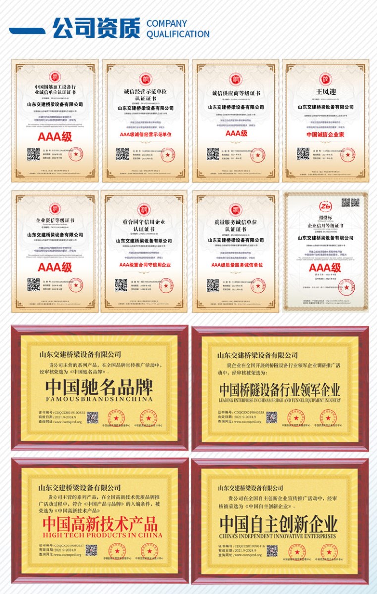 山東交建橋梁設備有限公司主要經(jīng)營數(shù)控鋼筋彎曲中心二機頭、數(shù)控鋼筋彎曲中心五機頭、數(shù)控鋼筋彎箍機、數(shù)控鋼筋籠滾焊機、鋼筋調直切斷機、鋼筋墩粗機等一系列鋼筋加工設備。